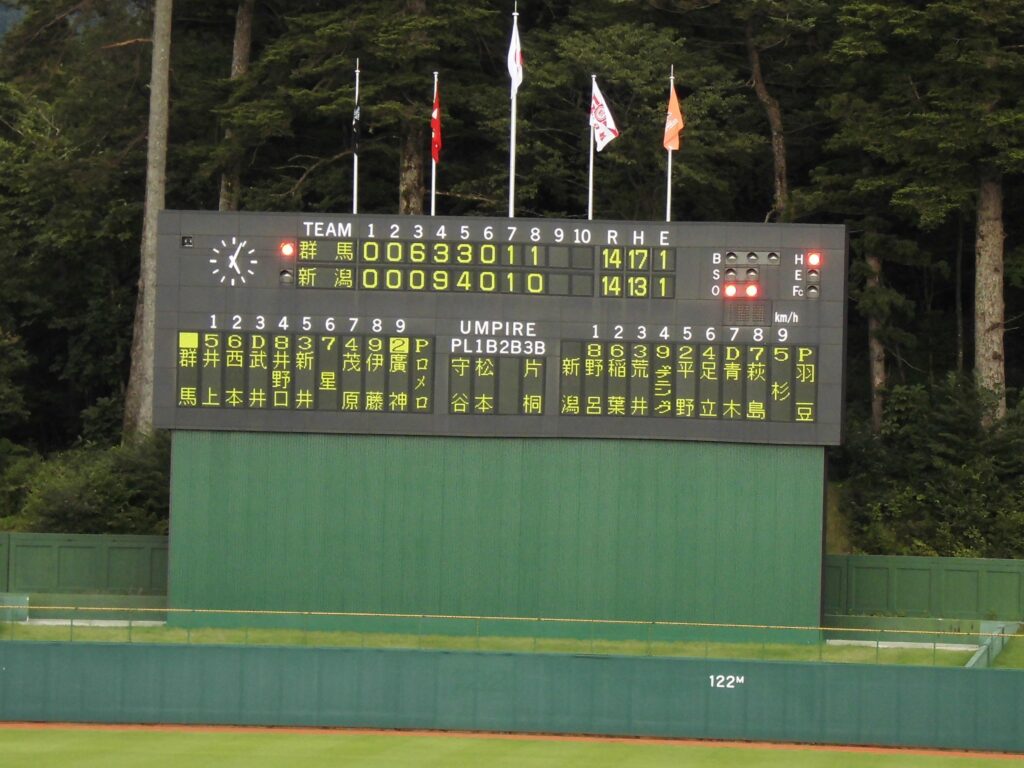 最近は新潟県内の野球場もスコアボードの改修が進み、高田公園や柏崎佐藤が池など大型のカラービジョンを備えて大きな画像や動画を表示できるところが増えました。全国的にそういう方向にあるようです。しかし、大きな電力を使うことになるので、節電、省エネを考えると、地方の市営野球場としては悠久山のスコアボード程度の機能があれば充分と思います。